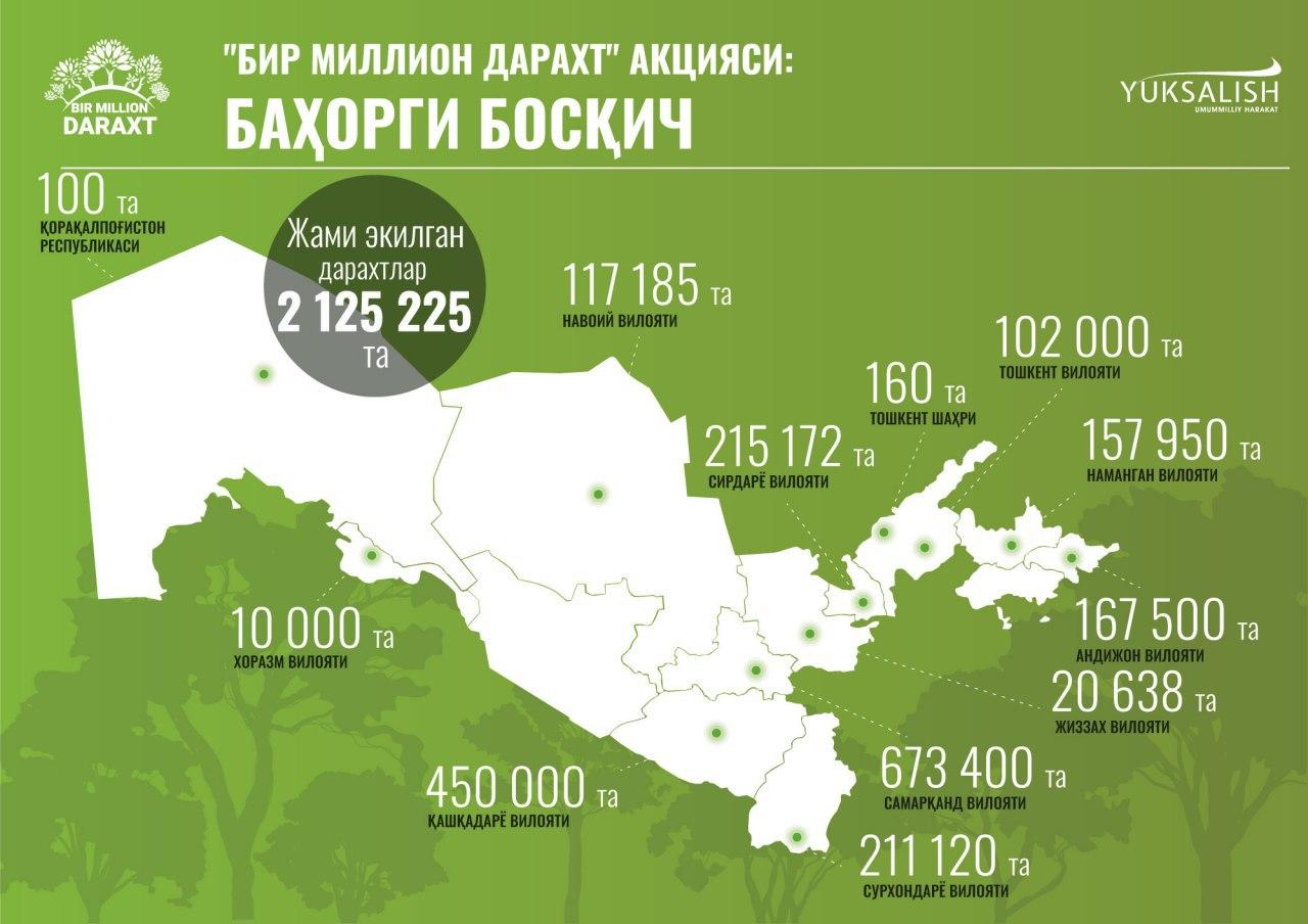 В целом, весенний этап акции охватил 12 регионов Узбекистана. Представители госструктур, разных учреждений, негосударственных некоммерческих организаций, молодежи, пожилые — активные граждане, пожелавшие внести свой вклад в благое дело. За первые две недели посажено 2 125 225 декоративных и плодовых деревьев. Осенью прошлого года посажено 1 650 113 деревьев в 8 регионах Узбекистана.