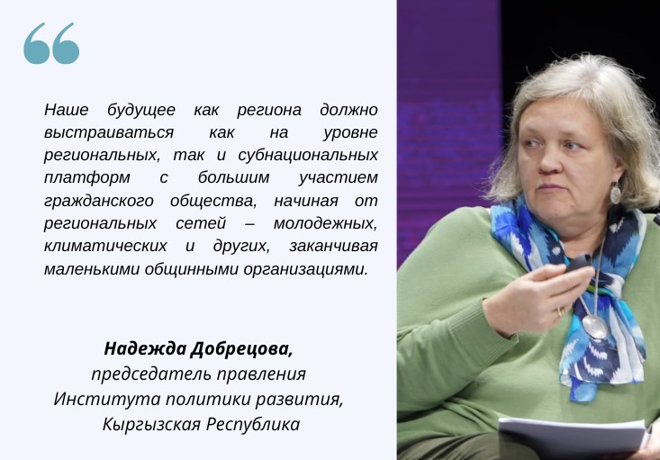 Главный посыл Недели гражданского общества в Узбекистане для других стран региона заключается в том, что диалог между гражданским обществом и государством важен, осуществим и является одной из целей государственной политики. Второй посыл в том, что диалог между местными сообществами и центральными властями также важен как на национальном, так и на региональной уровне, но эффективен при участии гражданского общества. И третий важный посыл в том, что наше будущее как региона должно выстраиваться как на уровне региональных, так и субнациональных платформ с большим участием гражданского общества, начиная от региональных сетей – молодежных, климатических и других, заканчивая маленькими общинными организациями.